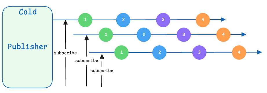 Cold Publisher는 Subscriber가 구독을 시작하는 순간부터 데이터를 생성하고 전달하는 구조입니다.