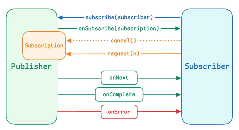 이를 통해 스트림 처리는 유연하게 연결됩니다. - Caller는 Subscriber를 등록하여 Back-pressure를 통해 처리 속도를 제어합니다.