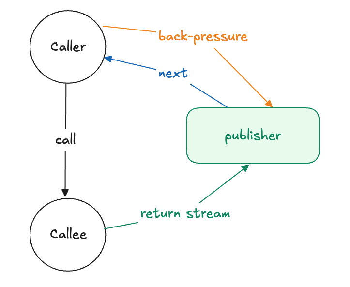 대신, 처리 결과를 담을 수 있는 Publisher를 제공합니다. - Callee는 각각의 데이터를 Publisher를 통해 전달합니다.