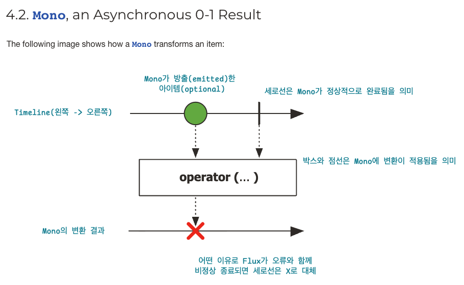 Mono는 단일 결과를 표현하는 데 적합하며, API 호출 결과나 단일 데이터 조회와 같은 상황에서 자주 사용됩니다. 대부분의 Mono 구현체는 값을 발행(onNext)한 후 즉시 onComplete를 호출하여 스트림을 종료합니다.