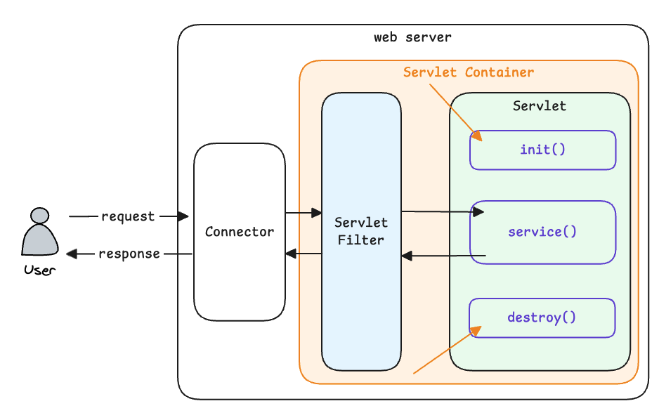 - Connector: HTTP 요청을 HttpServletRequest 객체로 변환