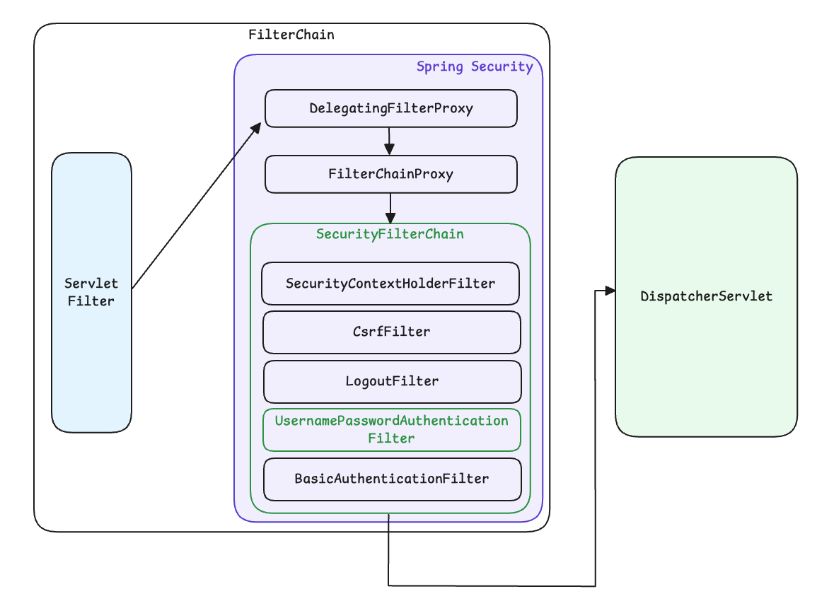 그러나 Servlet 환경에서는 Servlet 컨테이너가 Spring의 보안 체인을 직접 알지 못하기 때문에, 이를 연결하기 위한 DelegatingFilterProxy가 먼저 요청을 받아 Spring Security 영역으로 위임하고, 이후 FilterChainProxy가 요청에 맞는 SecurityFilterChain을 선택하여 실제 보안 처리를 수행했습니다.