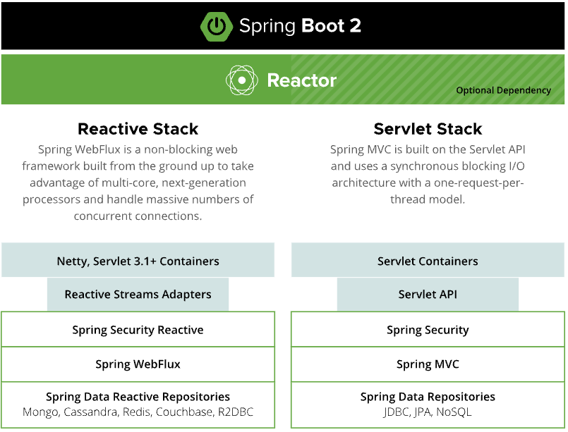 Spring 생태계는 전통적인 동기식 Servlet 기반 스택과, 비동기 리액티브 기반 스택을 동시에 제공하며, Spring Security는 이 두 환경 모두에서 보안을 일관되게 적용할 수 있도록 기본적으로 지원합니다.