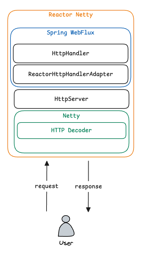 Spring은 WebFlux를 설계하면서 HTTP 요청 처리 구조를 기존 서블릿 방식과는 다르게 가져가기로 판단했습니다. 그 이유는 비동기 · 논블로킹 환경에서 HTTP I/O 처리와 애플리케이션 로직이 동일한 계층에 존재할 경우 구조적 복잡성과 확장성 한계가 발생하기 때문입니다.
