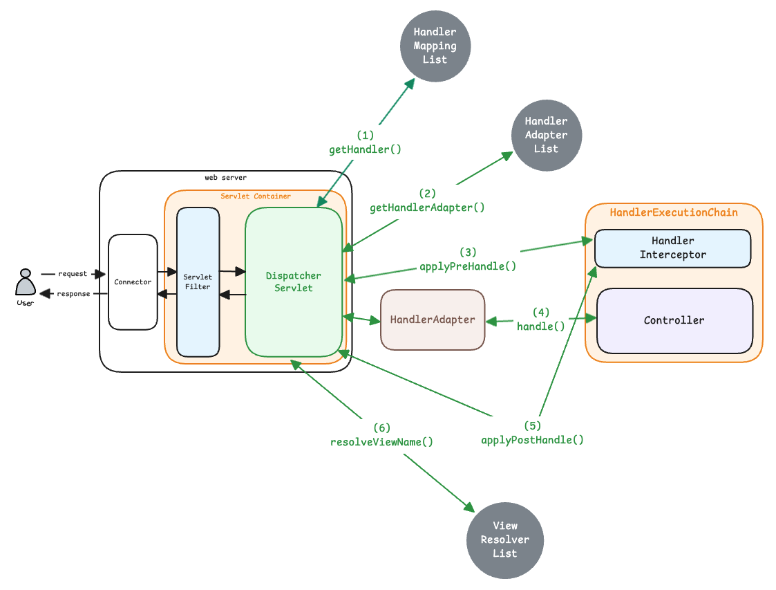 DispatcherServlet은 요청이 들어오면, 내부에 등록된 HandlerMapping 목록을 순회하며 현재 요청을 처리할 수 있는 핸들러를 탐색합니다. 이후 매칭되는 HandlerExecutionChain이 발견되면, 해당 체인에 포함된 Handler를 실행할 수 있는 HandlerAdapter를 찾기 위해 등록된 Adapter 리스트를 다시 순회하고, 실행 가능한 Adapter를 선택하여 처리 과정을 진행합니다.