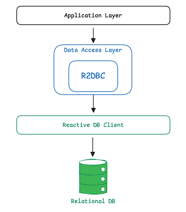 R2DBC는 JDBC와 달리 스레드를 점유하지 않고 비동기적으로 데이터 스트림을 처리하며, 결과를 Mono와 Flux 형태로 전달합니다. 이 과정에서 스레드는 특정 요청에 고정되지 않고 이벤트 루프를 통해 재사용되며, DB 응답 대기 시간 동안에도 다른 요청을 처리할 수 있습니다. 커넥션 역시 요청 단위로 장시간 점유되지 않고, 리액티브 시퀀스 흐름에 따라 필요한 순간에만 사용됩니다. 트랜잭션 또한 ThreadLocal 대신 Reactor Context 기반으로 관리되며, 리액티브 체인 전체에 걸쳐 논블로킹 방식으로 트랜잭션 범위가 유지됩니다.