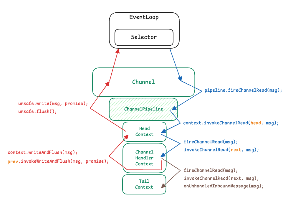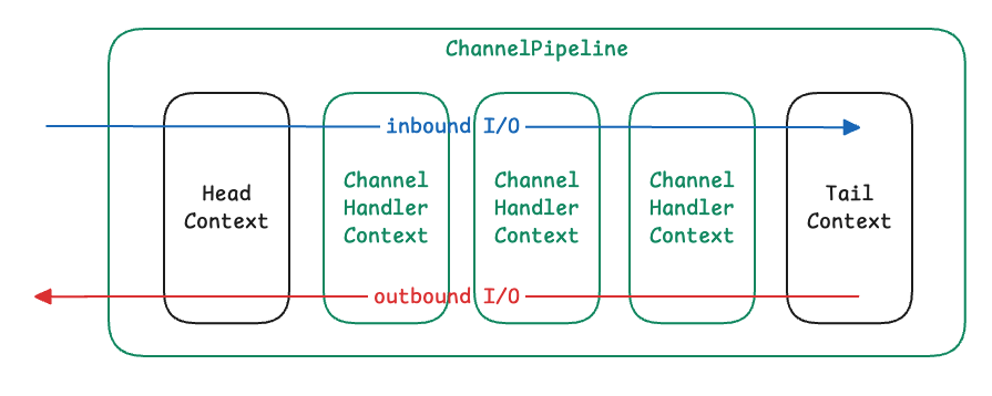 즉, 소켓에서 들어오는 이벤트들이 도착했을 때 호출되며, 이벤트 흐름은 Pipeline의 앞에서 뒤로 전파됩니다.