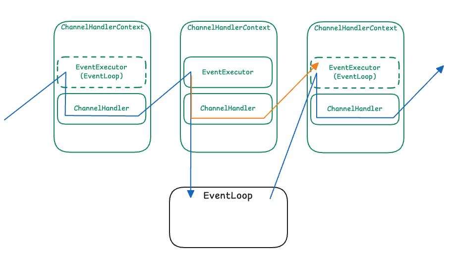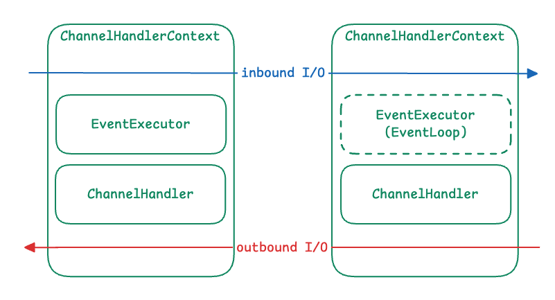 각 ChannelHandlerContext는 반드시 하나의 ChannelHandler를 포함하며, 이는 Pipeline 내 Handler의 실행 위치를 나타내는 필수 구성 요소입니다. 반면 EventExecutor는 선택적이며, Handler를 등록할 때 별도의 EventExecutorGroup을 지정한 경우에만 생성됩니다. 별도로 지정하지 않으면 해당 Context는 Channel이 바인딩된 EventLoop를 그대로 실행 스레드로 사용합니다.