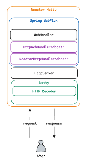 이를 연결하기 위해 WebFlux는 ReactorHttpHandlerAdapter를 제공하며, 이 어댑터가 HttpHandler를 Reactor Netty에서 요구하는 함수 형태로 변환해 HttpServer.handle(...)에 전달할 수 있도록 해줍니다.