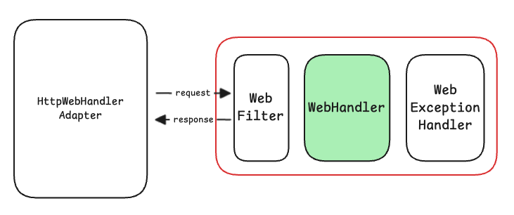 HttpHandler는 어디까지나 서버(Reactor Netty, Tomcat 등)와 WebFlux 사이의 공통 진입점 역할을 하고, 그 아래에서 WebHandler가 라우팅, 핸들러 실행, 필터 체인, 예외 처리 등을 담당합니다.