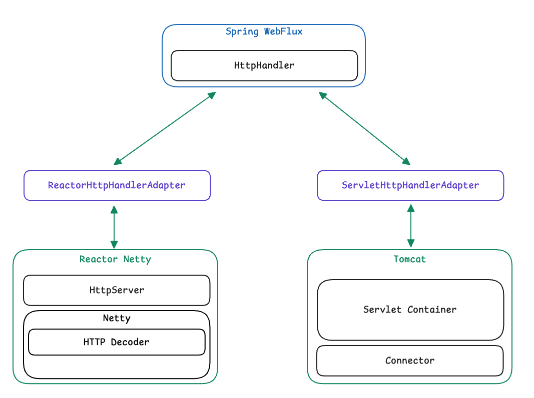 이를 해결하기 위해 WebFlux는 서버 독립적인 공통 요청 처리 지점으로 HttpHandler 인터페이스를 정의했습니다. 그리고 Netty 환경에서는 ReactorHttpHandlerAdapter, Servlet 환경에서는 ServletHttpHandlerAdapter가 HttpHandler를 각 서버가 요구하는 처리 방식에 맞게 변환해 연결합니다.