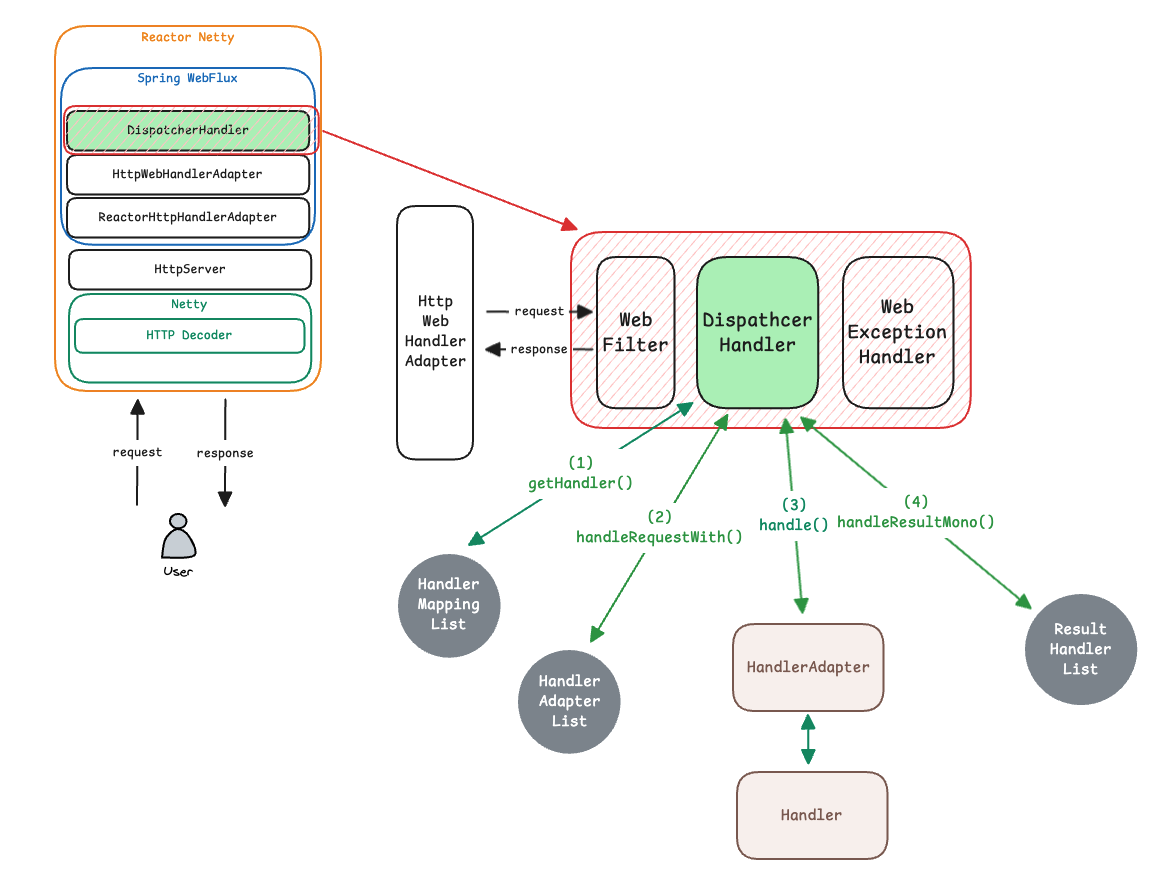 Spring WebFlux는 Spring MVC와 마찬가지로 Front Controller 패턴을 따릅니다. 이때 WebFlux 쪽에서 Front Controller 역할을 수행하는 핵심 컴포넌트가 바로 DispatcherHandler 입니다.