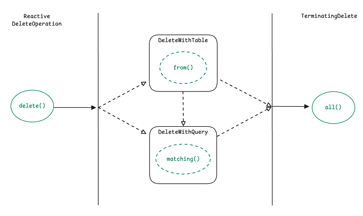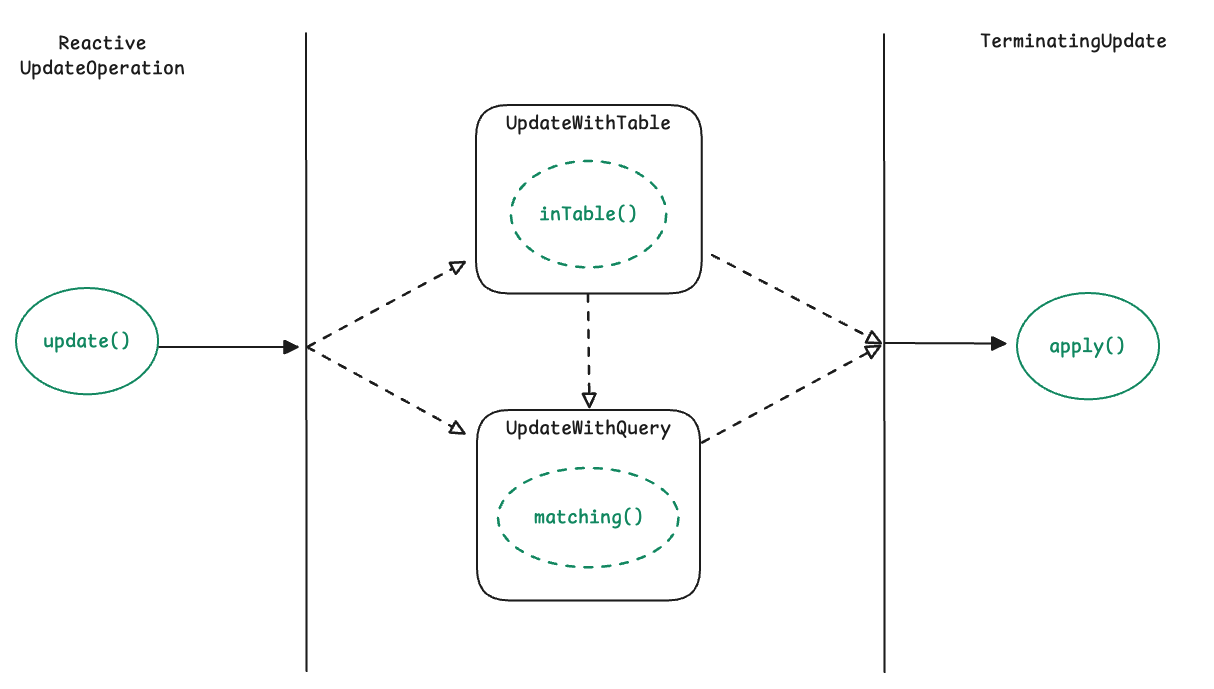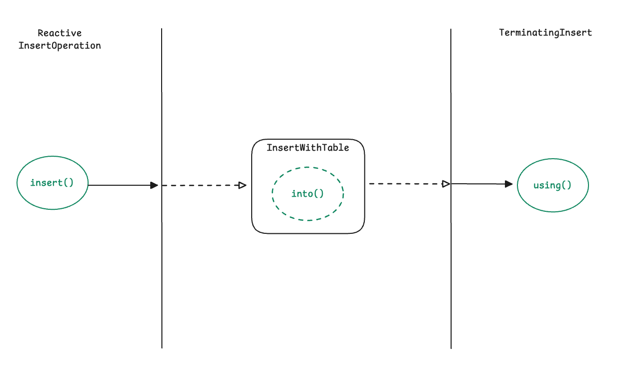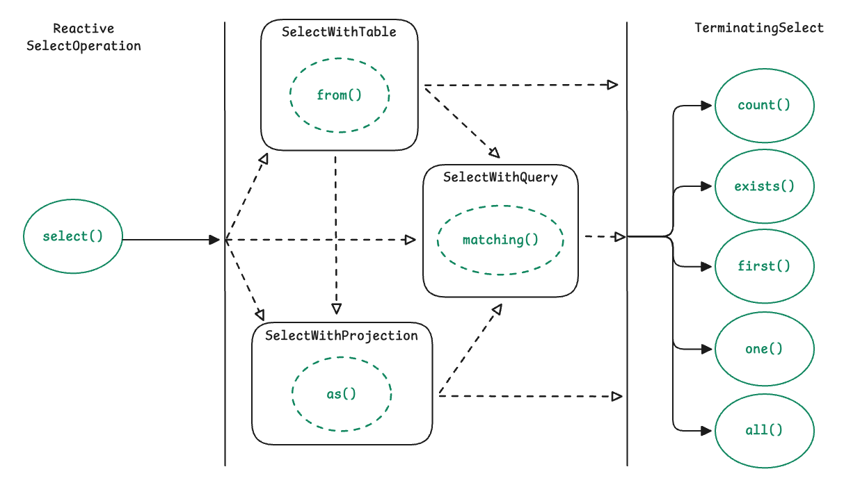 이 엔티티를 중심으로 동작하는 핵심 구성 요소가 R2dbcEntityTemplate입니다. 템플릿은 Insert, Select, Update, Delete 같은 작업을 직관적인 API 형태로 제공하며, 각 연산은 Fluent 스타일 체이닝으로 이어져 종단 연산에서 SQL을 생성하고 실행합니다. 또한 모든 종단 메서드는 Mono 혹은 Flux를 반환하며, 실제 SQL 실행은 Publisher가 구독(subscription) 되는 시점에 이루어집니다.