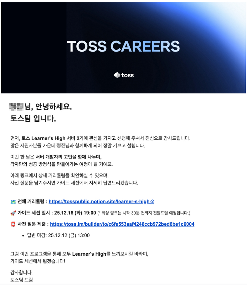 개발 역량을 한 단계 더 끌어올릴 수 있는 방법을 찾던 과정에서, 토스가 개발자를 대상으로 Learner’s High 멘토링 프로그램을 운영하고 있다는 것을 알게 되었습니다.