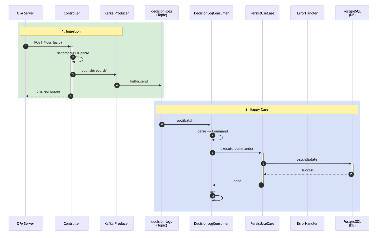Consumer는 로그를 도메인에서 사용하는 Command 객체로 변환한 뒤 PersistUseCase를 통해 DB에 batch 저장을 시도합니다. DB 저장이 성공하면 Consumer는 offset을 ack 하는 이 경우가 가장 일반적인 정상 처리 흐름입니다.