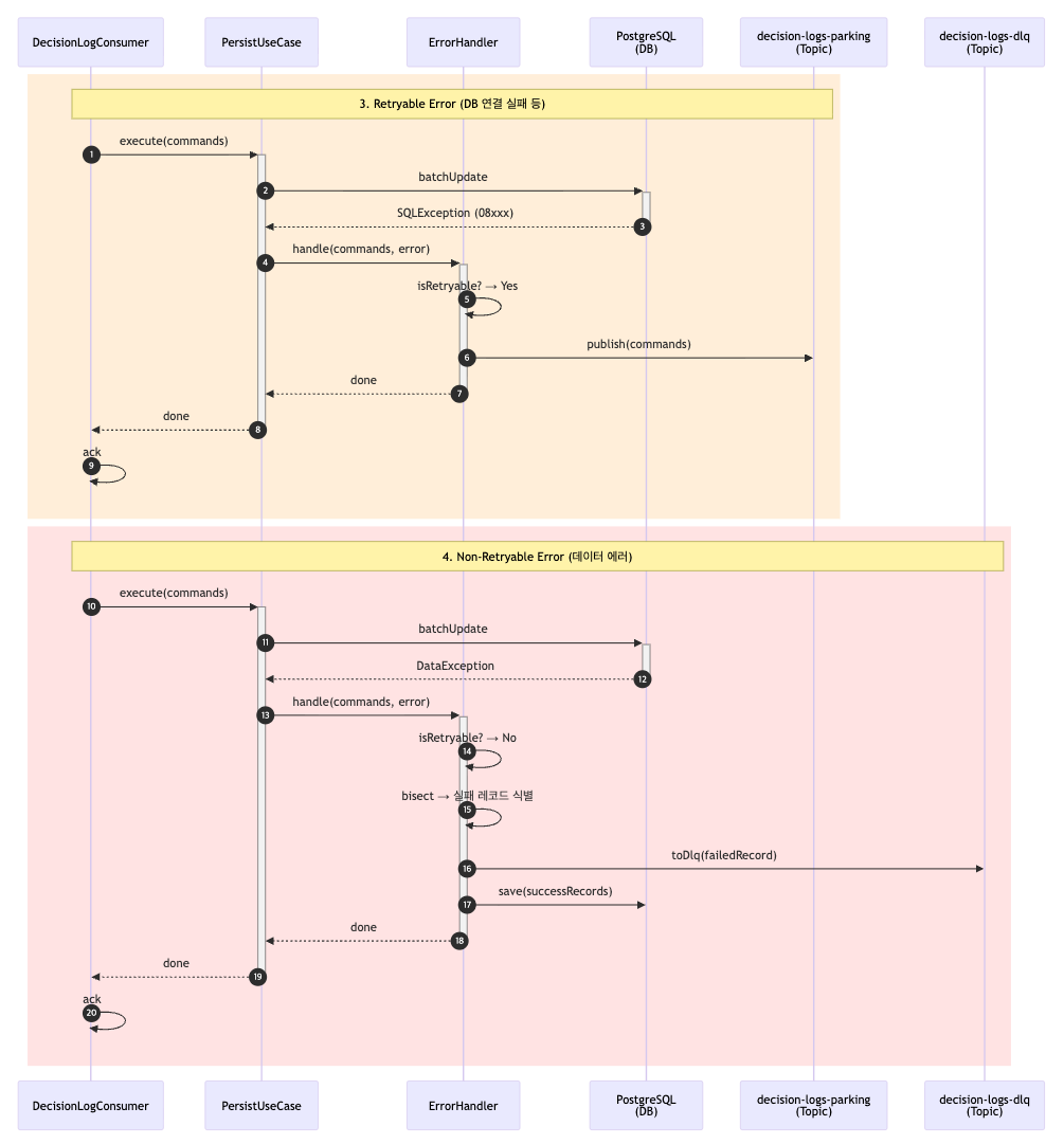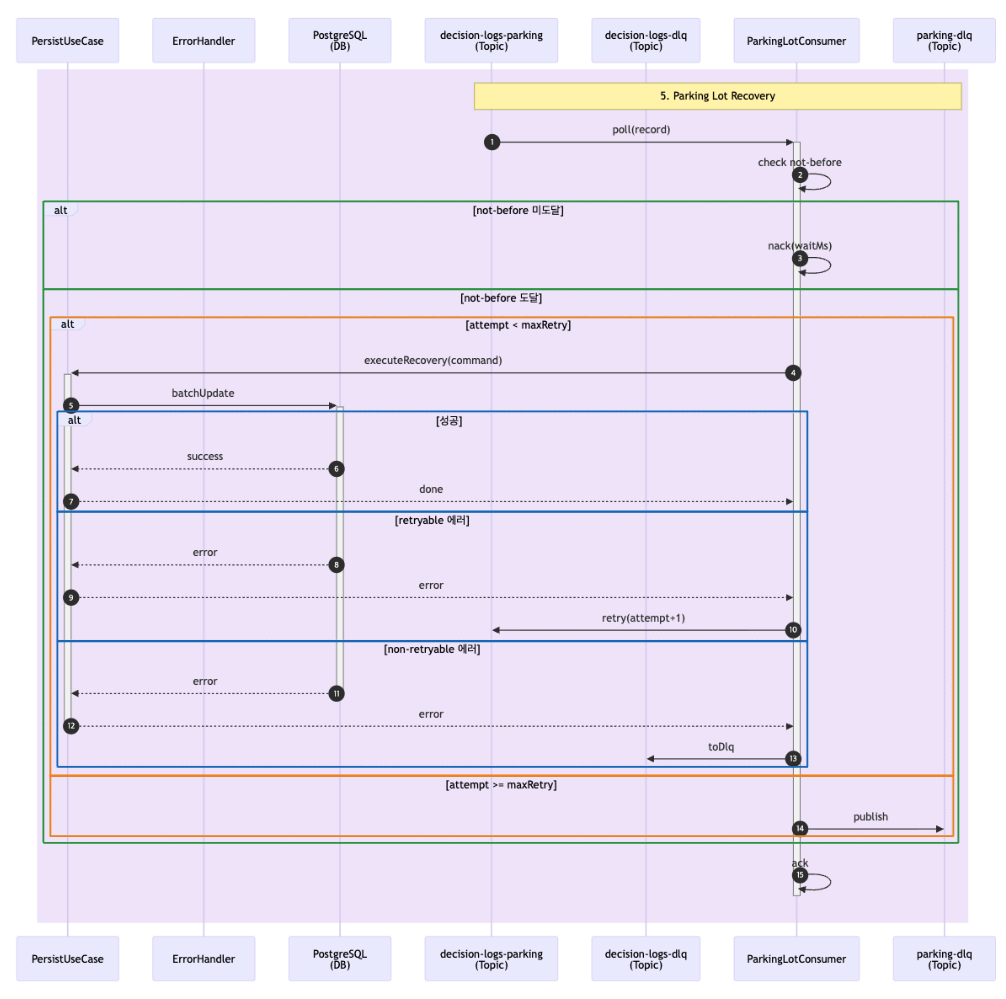 | 재시도 전략 | ErrorHandler 기반 단기 backoff | Parking Recovery 기반 장기 backoff |