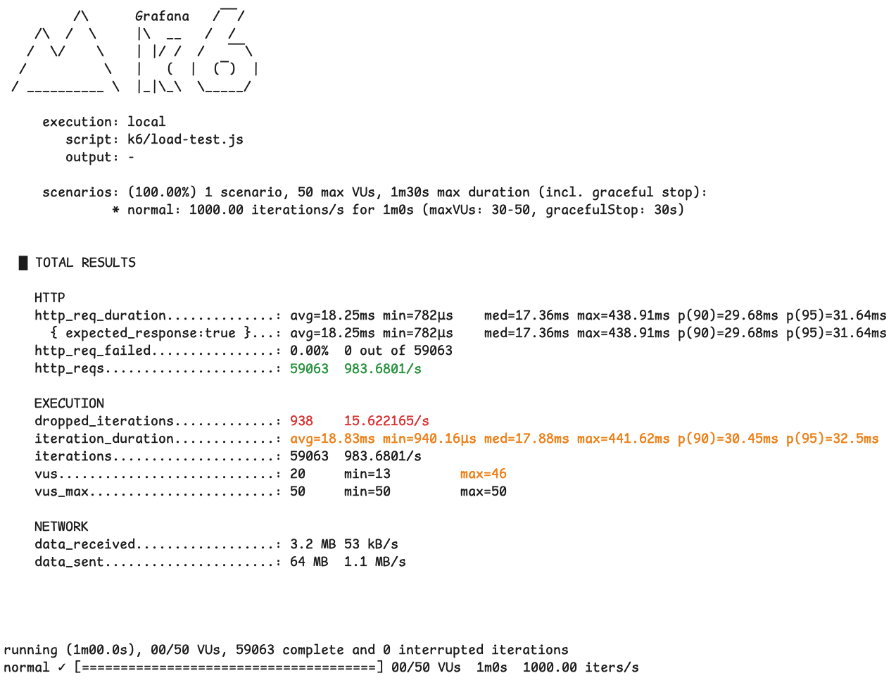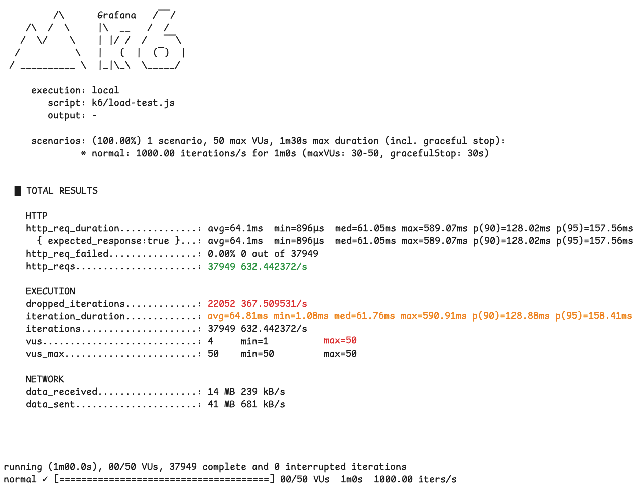 테스트 결과를 처음 보면 `http_req_failed` 가 0%로 표시되어 있기 때문에 모든 요청이 성공적으로 처리된 것처럼 보일 수 있습니다. 하지만 이 수치는 전송된 HTTP 요청 중에서 2xx 성공 응답이 오지 않은 개수로, 이 테스트에서 주의 깊게 봐야 할 지표는 HTTP 실패율이 아니라 dropped iterations입니다.