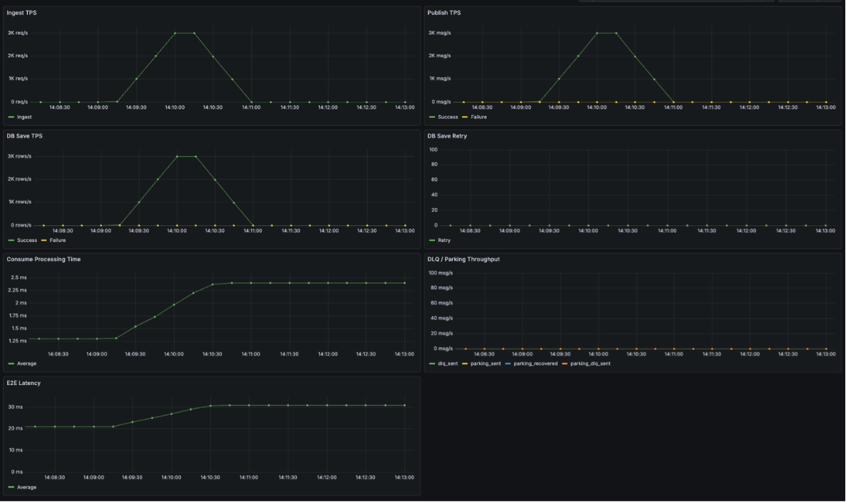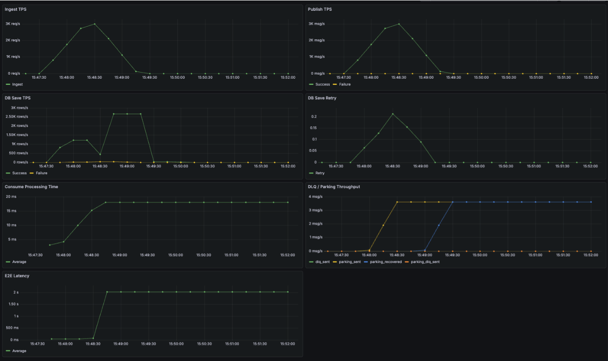 테스트 결과, 초당 1,000건의 요청이 안정적으로 수신되었으며 Kafka 발행과 DB 저장 역시 배치 처리 기반으로 정상적으로 처리되었습니다. 특히 수신 시점부터 DB 저장까지의 E2E Latency가 안정적으로 유지되었고, DLQ나 Parking Lot으로 분기되는 로그 없이