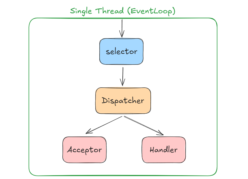 Reactor Pattern을 그림처럼 표현할 수 있으며, Selector는 Demultiplexer 역할을 수행하여 들어오는 요청들을 적절한 Handler에게 동기적으로 전달합니다. 이때, Acceptor와 Handler는 모두 EventHandler 인터페이스의 구현체입니다. 다만, accept()를 담당하는 Acceptor는 다른 처리 로직을 따로 구분하여 관리하는 경우가 많기 때문에 구분하여 표현하였습니다.