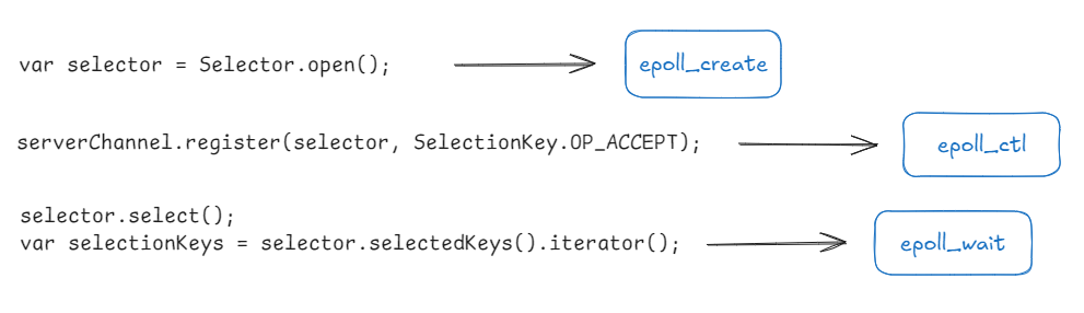 앞에서 알아본 Selector와 epoll은 비슷한 Event-driven 방식의 system call을 사용하여 I/O Multiplexing을 처리하기 때문에 동작을 다음과 같이 매칭해 볼 수 있습니다.