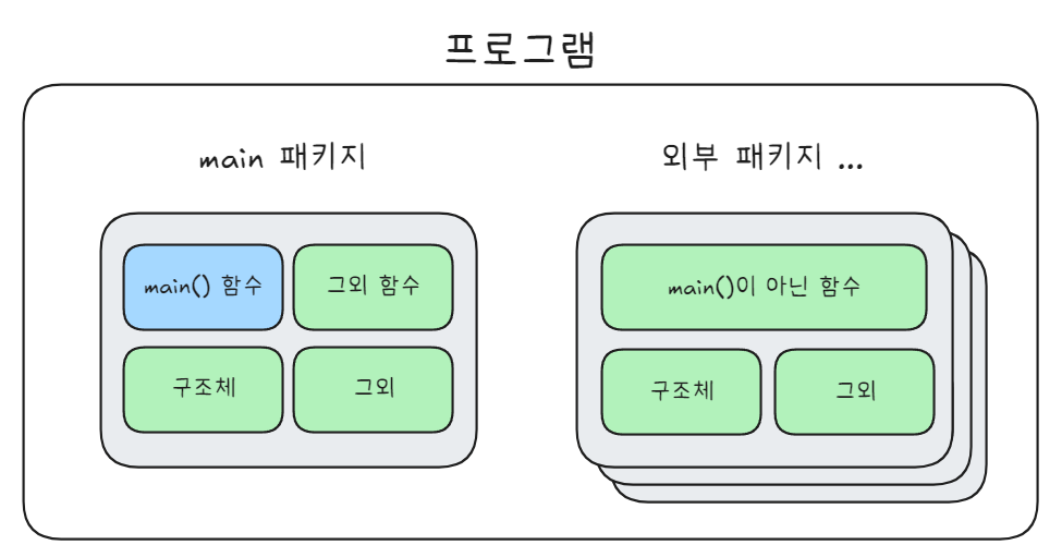 일반적으로 "디렉터리명 = 패키지명"으로 맞추는 것이 관례이나 반드시 main() 함수가 있는 main.go 파일은 패키지를 main으로 선언해야 합니다.