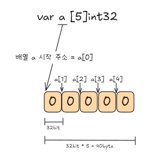 - float64 타입 요소를 5개 갖는 배열 temps를 할당 후 첫 번째, 두 번째 요소를 초기화하고 나머지는 float64 타입의 기본값인 0.0으로 초기화됩니다.