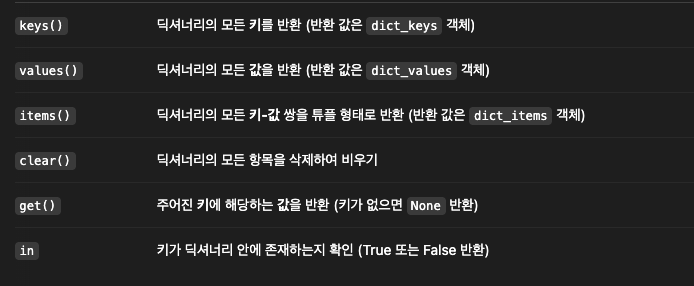 dict_keys, dict_values, dict_items는 파이썬의 딕셔너리에서 반환되는 객체 유형입니다. 이들은 딕셔너리의 키, 값, 그리고 키-값 쌍을 나타내는 특별한 타입의 객체로, 반복 가능한(iterable) 객체로 처리됩니다.
