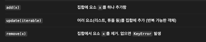 집합(set)은 중복을 허용하지 않고 순서가 없는 변경 가능한 자료형으로, 집합 연산에 유용하게 쓰입니다.