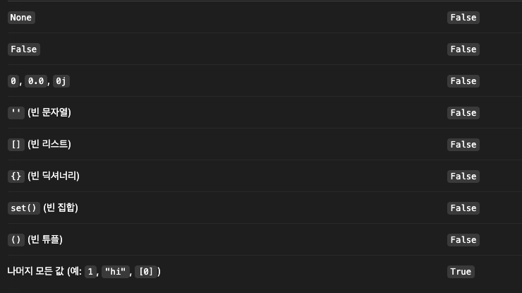 참과 거짓은 조건문의 결과로도 반환되지만, 다음의 표처럼 자료형의 값 자체로도 참과 거짓이 나누어집니다.
