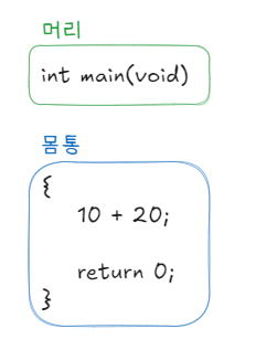 main 함수는 머리(head)와 몸통(body)으로 구성됩니다. 머리는 함수 원형(function prototype)이라고 하며 함수의 이름과 필요한 데이터등을 표시합니다. 몸통에는 함수에서 실행할 일을 작성하며 마지막에는 return 0; 을 넣어 프로그램을 종료합니다.