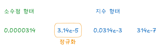 지수 형태를 지수 값의 크기에 따라 무수히 많은 방법으로 표현할 수 있습니다. 그중 소수점 앞에 0이 아닌 유효 숫자 한 자리를 사용해 지수 형태로 바꾼 것을 정규화 표기법이라고 합니다.