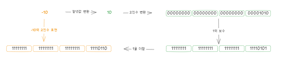컴퓨터에서 음수를 표현할 때는 절대값을 2의 보수로 바꾸어 처리합니다. 2의 보수란 2진수의 0과 1을 바꾼 상태(1의 보수)에서 1을 더한 값을 말합니다.