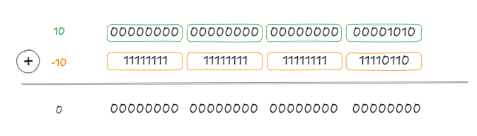 실제로 10과 -10의 모든 비트를 더하면 가장 왼쪽의 비트에서 자리 올림이 발생하고 남은 32비트는 모두 0이 되어 결과적으로 값 자체가 0이 됩니다. (정수는 4바이트이기 때문에 자리 올림된 상위 1비트는 버려지게 됩니다.)