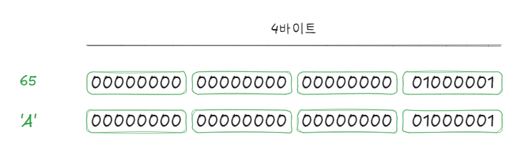 문자 상수를 컴파일하면 2진수 형태의 아스키 코드 값으로 번역됩니다. 예를 들어 문자 'A'의 아스키 코드 값은 65이므로 정수 상수 65와 같은 형태로 번역됩니다.