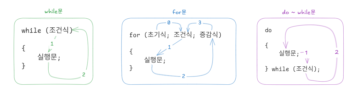 일정 조건을 만족하는 동안 같은 실행문을 반복하는 게 바로 반복문입니다. 따라서 반복문에는 항상 반복의 조건을 정의하는 조건식과 조건을 만족했을 때 실행하는 문장이 있으며, 다음과 같이 조건식의 위치에 따라 크게 while문, for문, do ~ while문 3가지로 구분할 수 있습니다.