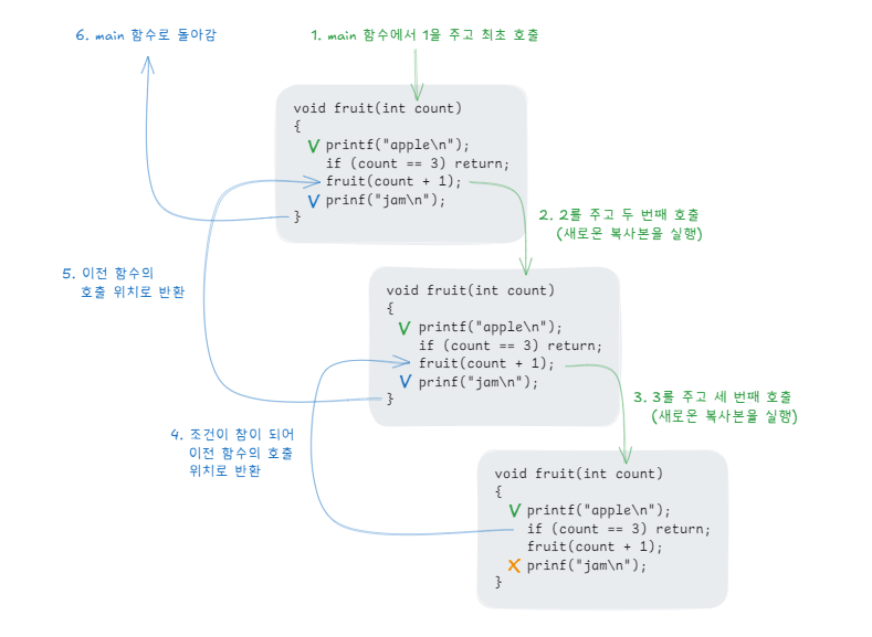 함수가 모든 명령을 수행하면 자동으로 반환하는데 반환 전에 자신을 호출하므로 처음부터 다시 시작합니다. 즉, 이렇게 계속 호출하면 함수는 끝나지 않고 apple을 계속 출력하다가 종료됩니다.