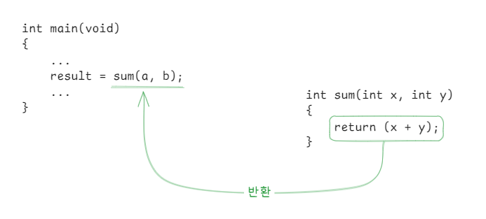 sum 함수에서 x와 y를 더하고 그 값을 함수가 호출된 곳으로 반환합니다. 이후 main 함수는 반환된 값을 대입 연산으로 result에 저장하고 잠시 중단했던 함수의 나머지 부분을 실행합니다.