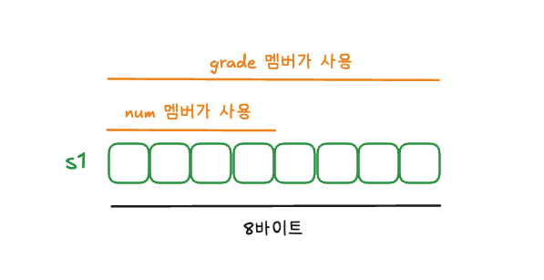 따라서 11행에서 union student의 변수를 선언하면 double형 멤버의 크기인 8바이트의 저장 공간이 할당되고 num과 grade 멤버가 하나의 공간을 공유합니다.