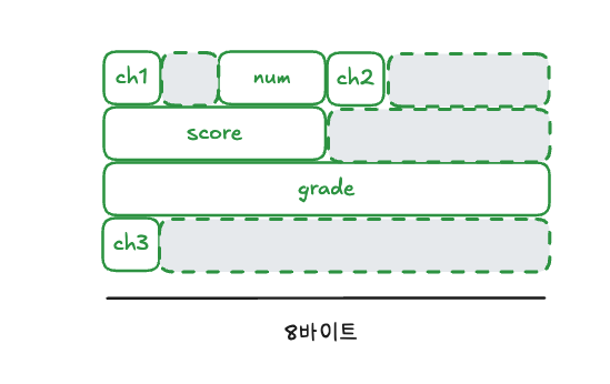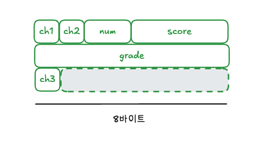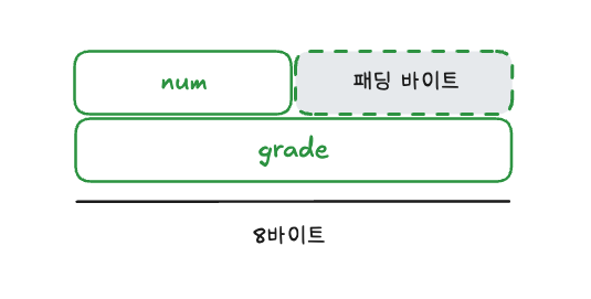모든 시스템은 데이터를 빠르게 읽고 쓰기 위해 일정한 크기 단위로 메모리에 접근합니다. 따라서 컴파일러는 구조체 멤버의 크기가 들쑥날쑥한 경우 멤버 사이에 패딩 바이트(padding byte)를 넣어 멤버를 가지런하게 정렬합니다. 이를 바이트 얼라인먼트(byte alignment)라고 합니다. 위 예시의 struct student 구조체는 grade 멤버의 크기가 가장 크므로 8바이트가 기준 단위가 됩니다. 따라서 num 멤버는 첫 번째 8바이트 블록의 처음 4바이트에 할당되고, grade 멤버는 남은 4바이트에 할당될 수 없으므로 다음 8바이트 블록에 할당됩니다. 결국 4바이트의 패딩 바이트가 포함되므로 전체 구조체의 크기는 16바이트가 됩니다.