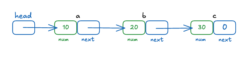 struct list a = {10, 0}, b = {20, 0}, c = {30, 0};