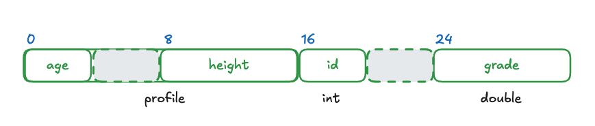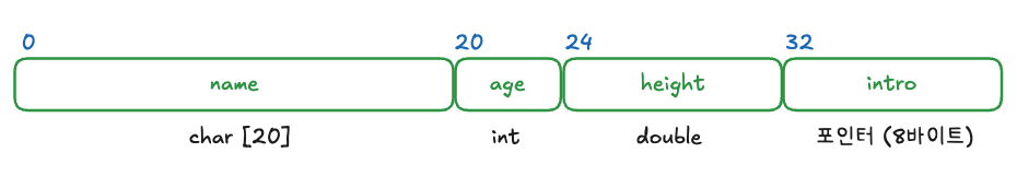 예를 들어 다음과 같이 구조체를 선언하면 크기는 32바이트가 됩니다.