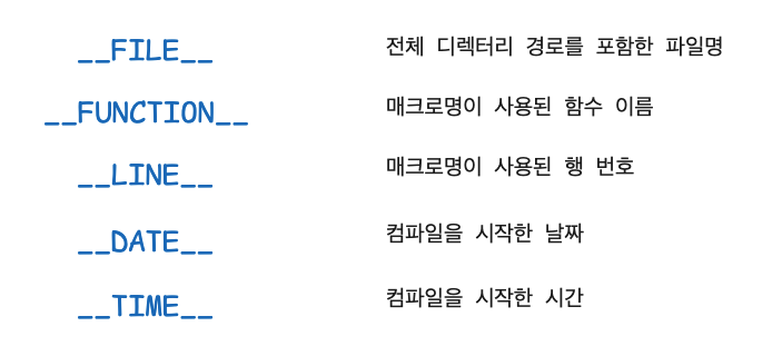 매크로에는 이미 그 정의가 약속되어 있어 사용자가 취소하거나 바꿀 수 없는 매크로명이 있습니다. 그 종류는 다양하고 컴파일러나 버전에 따라 다를 수 있으므로 디버깅에 유용한 몇 가지만 알아보겠습니다.