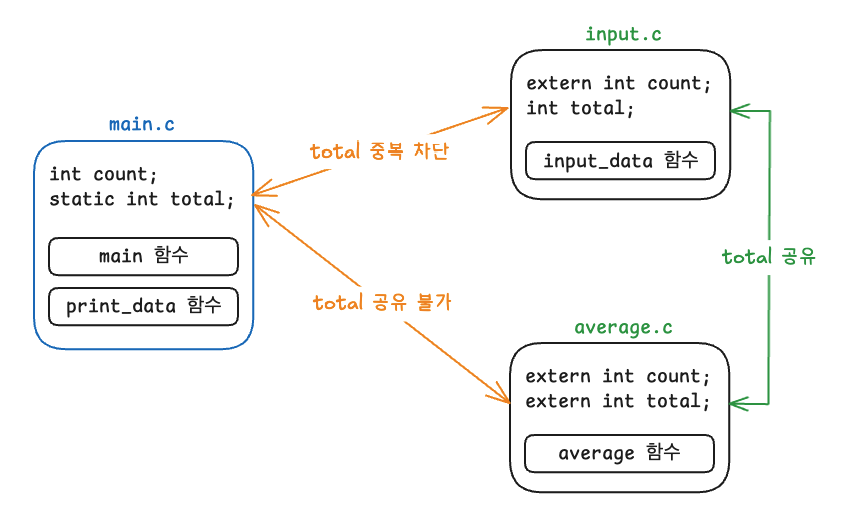 전역 변수에 static을 붙이면 하나의 소스 파일에서만 사용할 수 있습니다. main.c 파일의 8행에 선언한 total은 정적 전역 변수이므로 같은 파일에 있는 main 함수와 print_data 함수에서만 사용할 수 있습니다. 또한 input.c의 4행과 같이 다른 파일에 같은 이름의 전역 변수를 선언하는 것도 가능합니다. 이 경우 별도의 저장 공간을 갖는 전역 변수가 선언되며 average.c의 2행과 같이 다른 파일에서 extern 선언을 통해 공유할 수 있습니다.