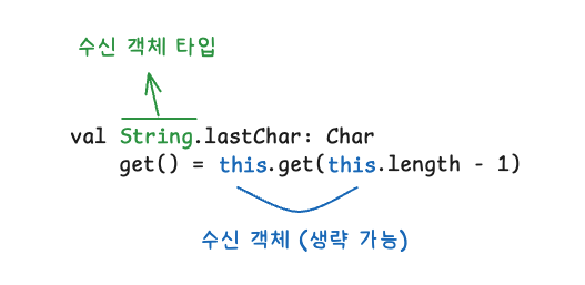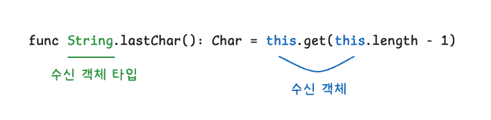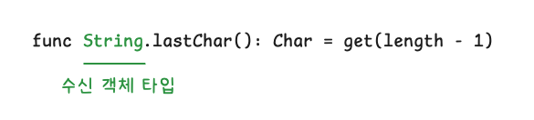위 예제에서 String이 수신 객체 타입이고, "Kotlin"이 수신 객체입니다.