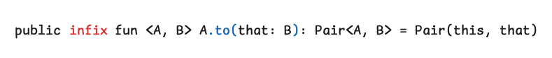 이 to 함수는 Pair의 인스턴스를 반환합니다. Pair는 코틀린 표준 라이브러리 클래스로, 이름 그대로 두 원소로 이뤄진 순서쌍을 표현합니다.
