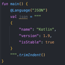 또는 항상 어떤 언어로 로우 문자열 리터럴을 주입하고 싶은 경우에는 @Language 어노테이션을 사용할 수 있습니다.