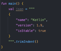 로우 문자열 리터럴에서는 코드를 보기 좋게 하기 위해 넣은 줄 바꿈과 들여쓰기가 모두 포함됩니다. 이런 경우 trimIndent 함수를 호출하면 문자열의 최소 들여쓰기를 찾아 그만큼의 공백을 일괄 제거해줍니다. 또한 맨 첫 줄과 마지막 줄에 있는 불필요한 개행도 제거해줍니다.