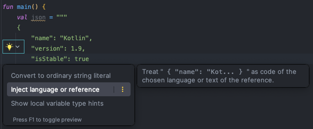 인텔리제이 IDEA에서는 로우 문자열 리터럴 내부에 대해 문법 하이라이팅을 지원합니다. 하이라이팅은 다음과 같이 활성화 할 수 있습니다.