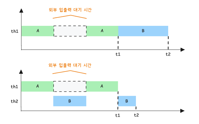 두 개의 작업을 하나의 쓰레드(th1)로 처리하는 경우와 두 개의 쓰레드(th1, th2)로 처리하는 경우를 가정해보겠습니다. 하나의 쓰레드로 두 작업을 처리하는 경우는 한 작업을 마친 후에 다른 작업을 시작하지만, 두 개의 쓰레드로 작업을 하는 경우에는 짧은 시간동안 2개의 쓰레드(th1, th2)가 번갈아 가면서 작업을 수행해서 동시에 두 작업이 처리되는 것과 같이 느끼게 합니다.