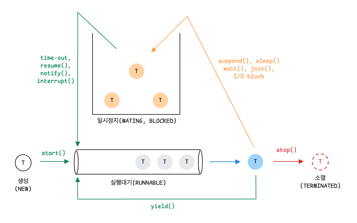 이때 주어진 시간동안 작업을 마치지 못한 쓰레드는 다시 자신의 차례가 돌아올 때까지 대기상태로 있게 되며, 작업을 마친 쓰레드, 즉 run()의 수행이 종료된 쓰레드는 호출스택이 모두 비워지면서 이쓰레드가 사용하던 호출스택은 사라집니다.